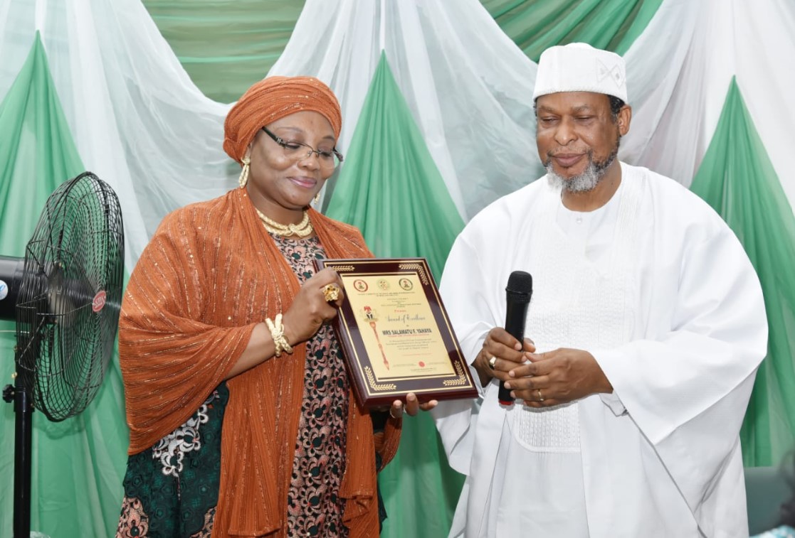 The President Nigerian Army Officer Wives Association (NAOWA) Mrs Salamatu F Yahaya receives the Quintessential Award of Excellence from the Joint Committee of the Senate and House of Representatives on Drug and Narcotics in collaboration with the National Association of Nigerian Drug Monitoring (NANDRUM).